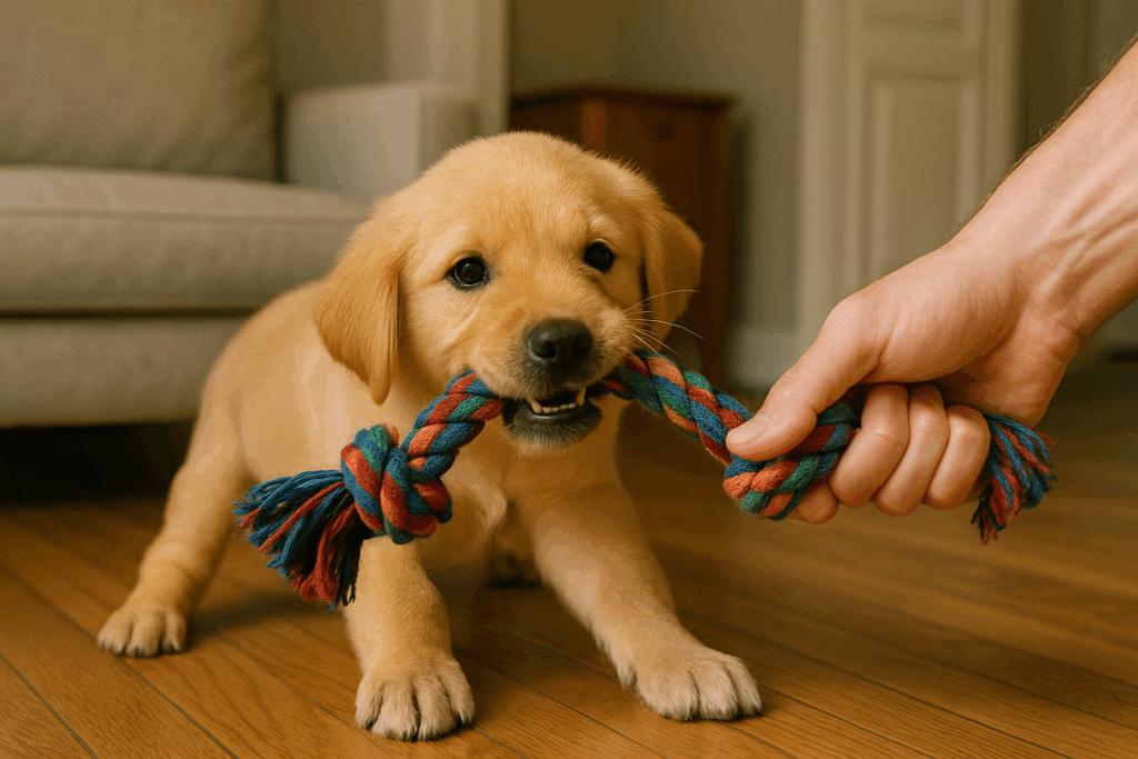 - 引っ張りっこ遊びができるロープやおもちゃを使って、人の手足以外のものを咬ませる